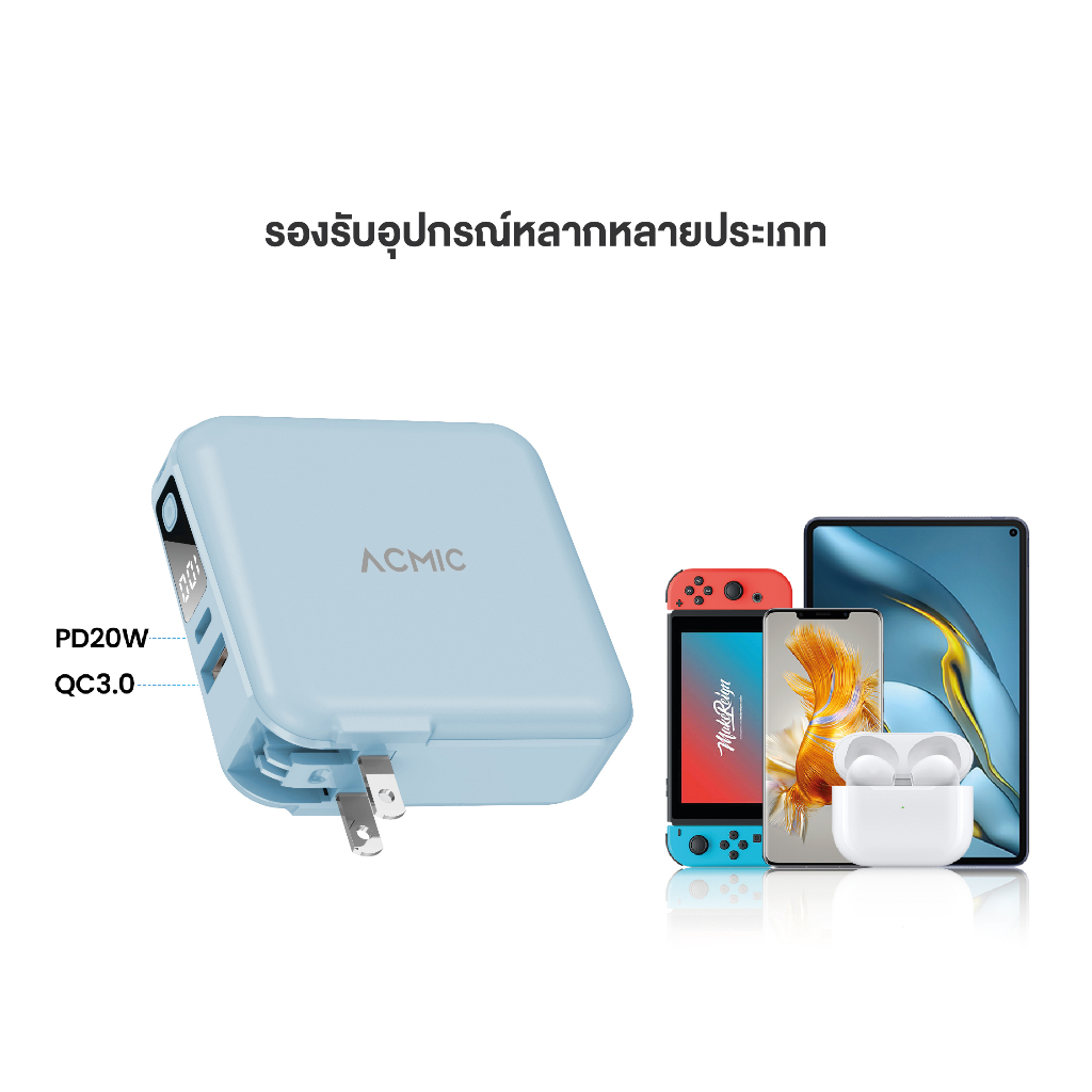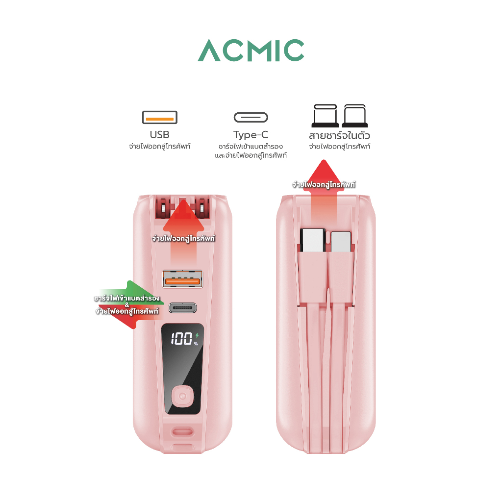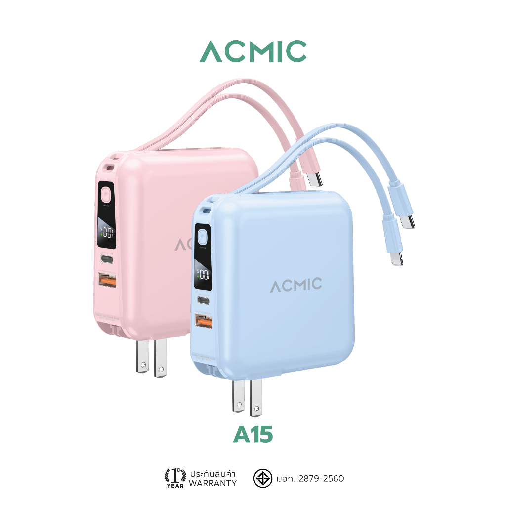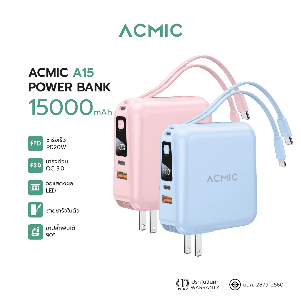 ACMIC A15 Powerbank 15000mAh สีชมพู/ฟ้า พาวเวอร์แบงค์ชาร์จเร็ว PD20W มีสายในตัว หน้าจอแสดงผล LED รับประกันสินค้า 1 ปี