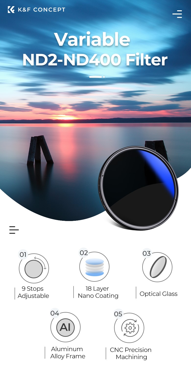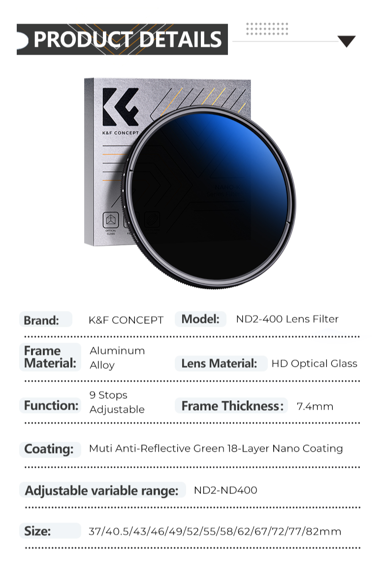 K&F CONCEPT ND2~400 ตัวกรองความหนาแน่นเป็นกลางแบบแปรผันบางเฉียบเป็นตัวกรองความหนาแน่นเป็นกลางแบบแปรผันประสิทธิภาพสูง เหมาะสำหรับการใช้งานถ่ายภาพที่หลากหลาย ควบคุมแสงที่เข้าสู่กล้องของคุณได้อย่างง่ายดายด้วยดีไซน์เพรียวบาง ฟิลเตอร์มีช่วงความหนาแน่นเป็นกลางที่ปรับได้ตั้งแต่ ND2 ถึง ND400 ทำให้คุณมีความยืดหยุ่นในการปรับเวลารับแสงและความชัดลึกโดยไม่ต้องเปลี่ยนความเร็วชัตเตอร์และรูรับแสง ฟิลเตอร์เคลือบสีน้ำเงินเพื่อให้ประสิทธิภาพการมองเห็นที่ยอดเยี่ยมและเอฟเฟกต์ป้องกันแสงสะท้อน ชุดนี้ยังมาพร้อมกับผ้าทำความสะอาดเครื่องดูดฝุ่นสามผืนเพื่อการทำความสะอาดและบำรุงรักษาตัวกรองที่ง่ายดาย