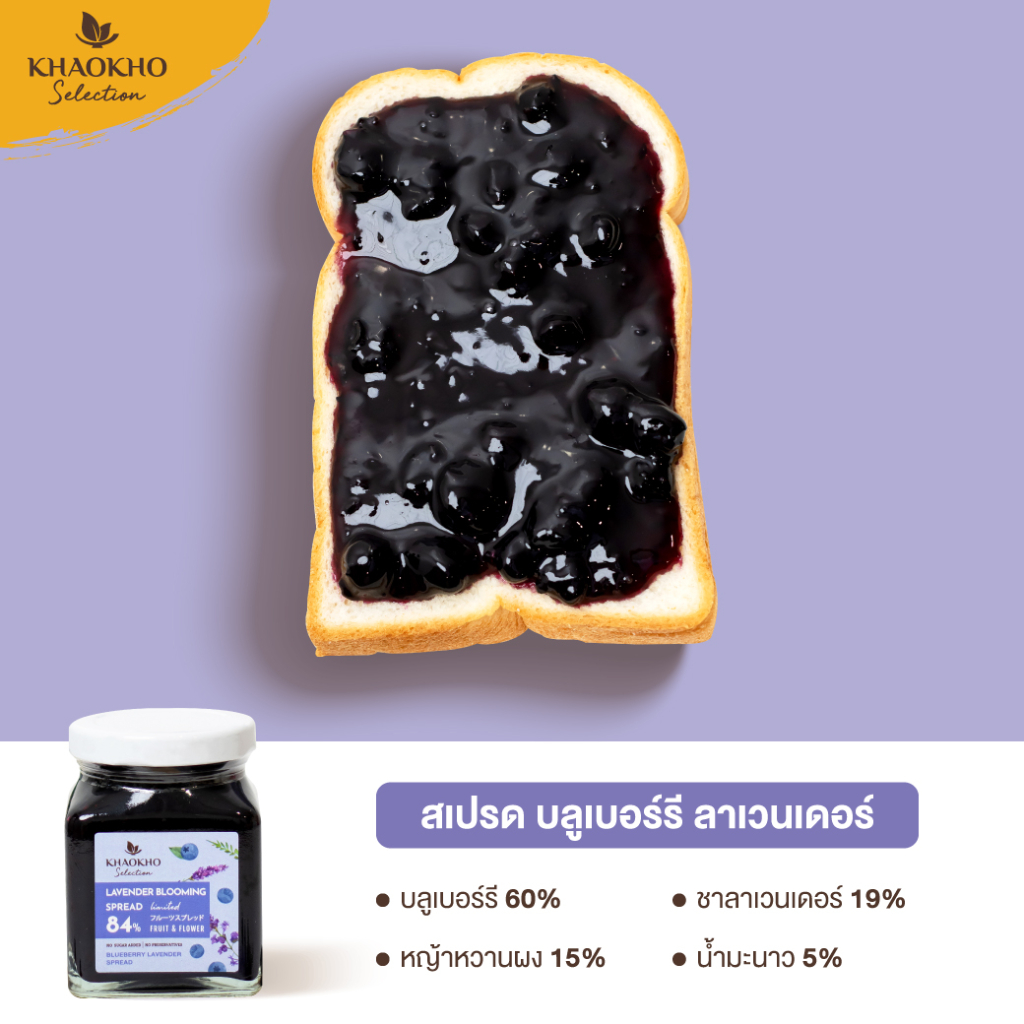 ผลิตภัณฑ์ทาขนมปังจากธรรมชาติ สูตรไม่เติมน้ำตาล ดอกไม้และผลไม้รวมกัน สูงถึง 84% กลิ่นหอมอบอวลจากดอกลาเวนเดอร์ ผสมผสานด้วยรสชาติหวานอมเปรี้ยวนิดๆจากบลูเบอร์รี ที่กลมกล่อมเข้ากันอย่างลงตัว