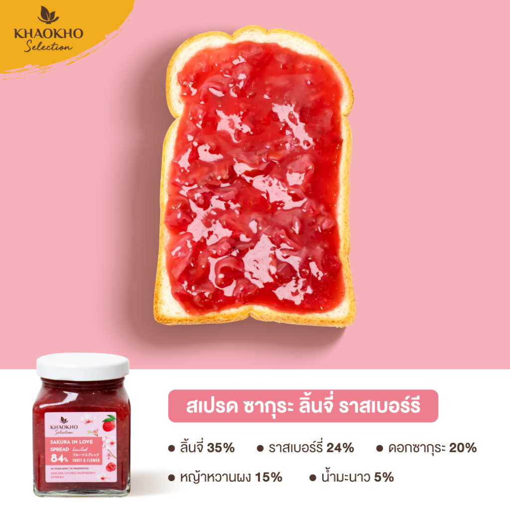 ผลิตภัณฑ์ทาขนมปังจากธรรมชาติ สูตรไม่เติมน้ำตาล ดอกไม้และผลไม้รวมกัน สูงถึง 84% กลิ่นหอมหวานจากเนื้อลิ้นจี่เต็มคำ ผสมด้วยความเปรี้ยวสดชื่นจากราสเบอร์รี เติมความพรีเมียมด้วยดอกซากุระที่ส่งตรงจากประเทศญี่ปุ่น ผสมผสานรสชาติเปรี้ยวและหวานเข้ากันอย่างลงตัว