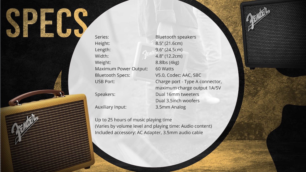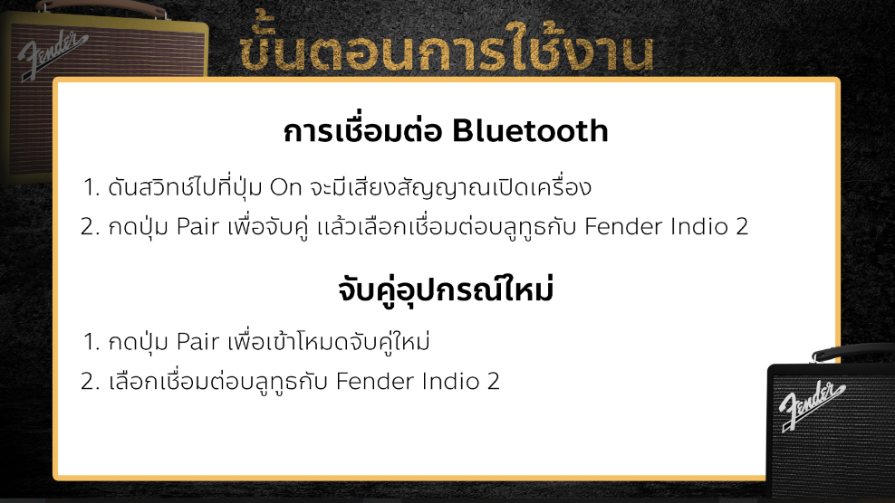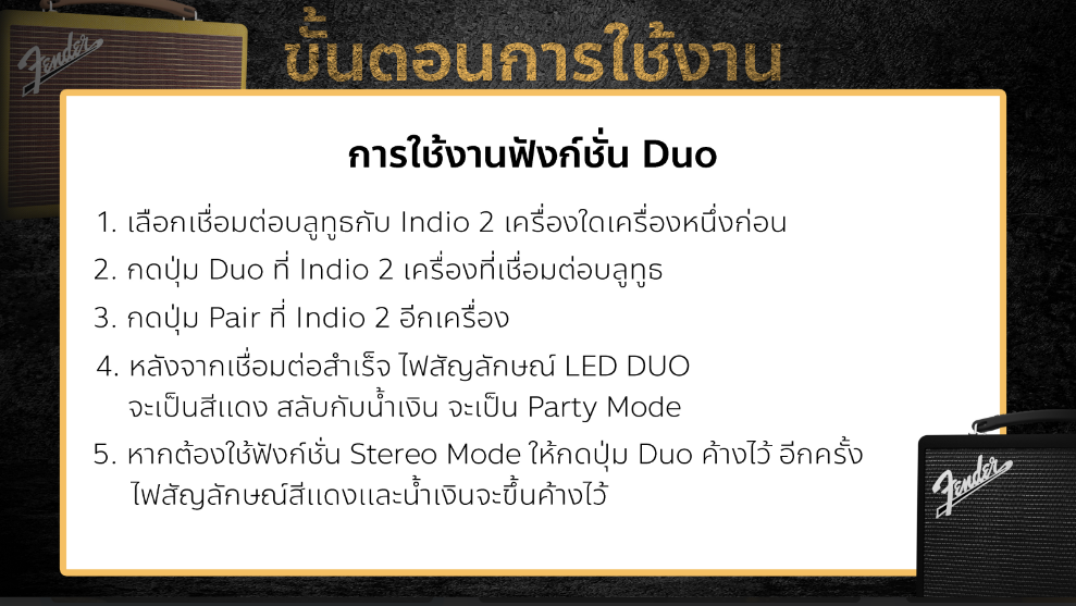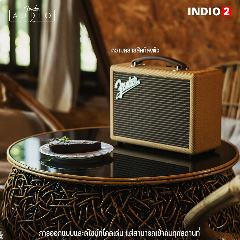 Fender indio ลำโพงบูลทูธสตรีมมิ่งระดับพรีเมี่ยมจาก Fender เหมาะสำหรับแฟนพันธุ์แท้ Audio phile หรือผู้ที่ชื่นชอบการฟังเพลง รวมถึงลำโพงวูฟเฟอร์ 2 ตัวและทวีตเตอร์ 2 ตัว ซึ่งมีกำลังขับถึง 60 วัตต์ ภายใต้รูปลักษณ์แอมป์กีต้าร์แบบคลาสสิกของ Fender ทำให้ Fender indio Fender’s ’59 Bassman amplifier ไฟ LED สีแดง และมีปุ่มปรับระดับ เพื่อปรับระดับเสียงเบสและเสียงแหลม