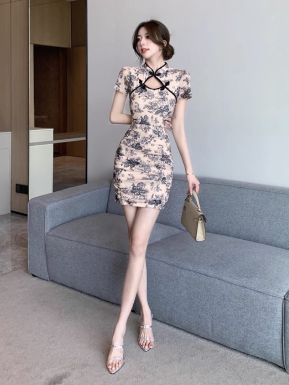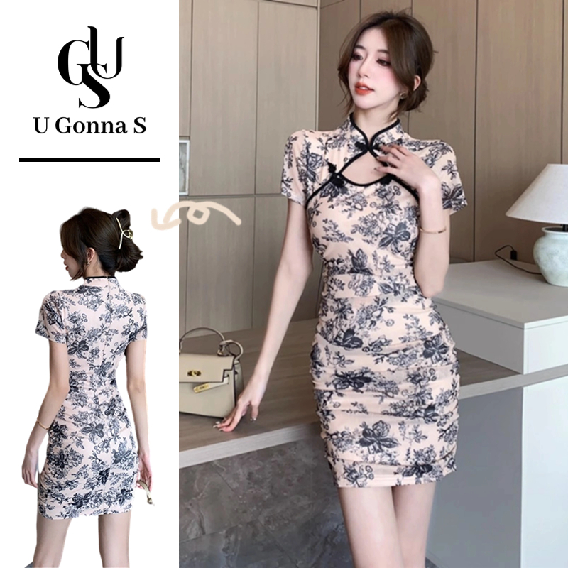 ชุดเดรสกี่เพ้า แขนสั้น คอจีน เอวสูง ลายดอกไม้ สไตล์โมเดิร์น หรูหรา